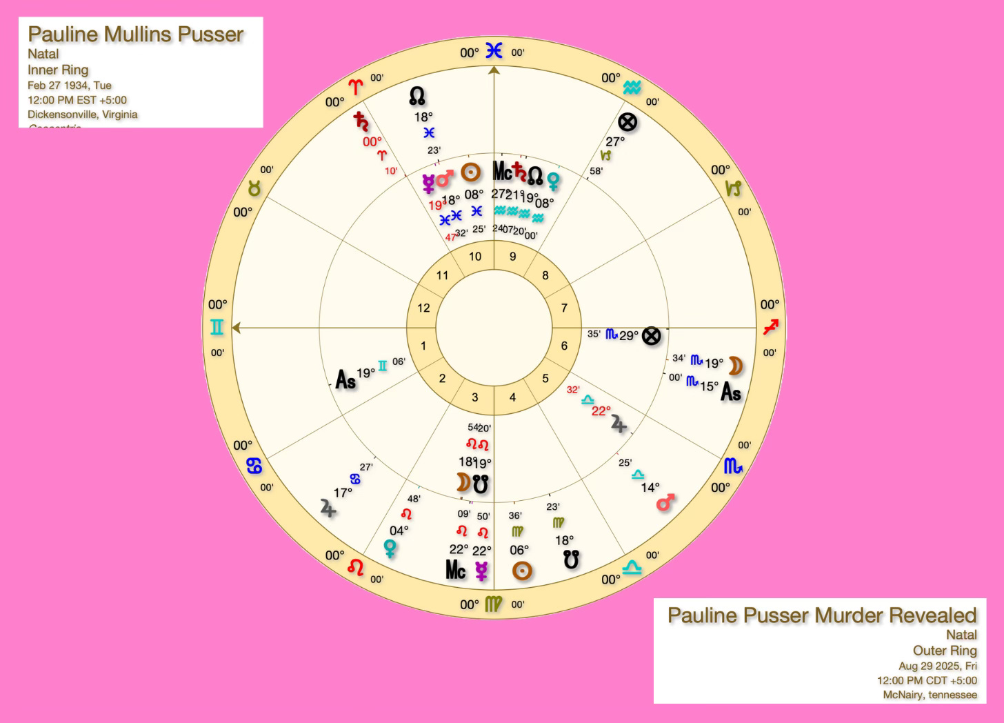 Mrs Pauline Mullins Pusser was born with the Sun in Pisces. While her exact birthtime remains unknown, we do know she died at 33, during a 10th House profection year, often referred to as the 'Jesus Year.'